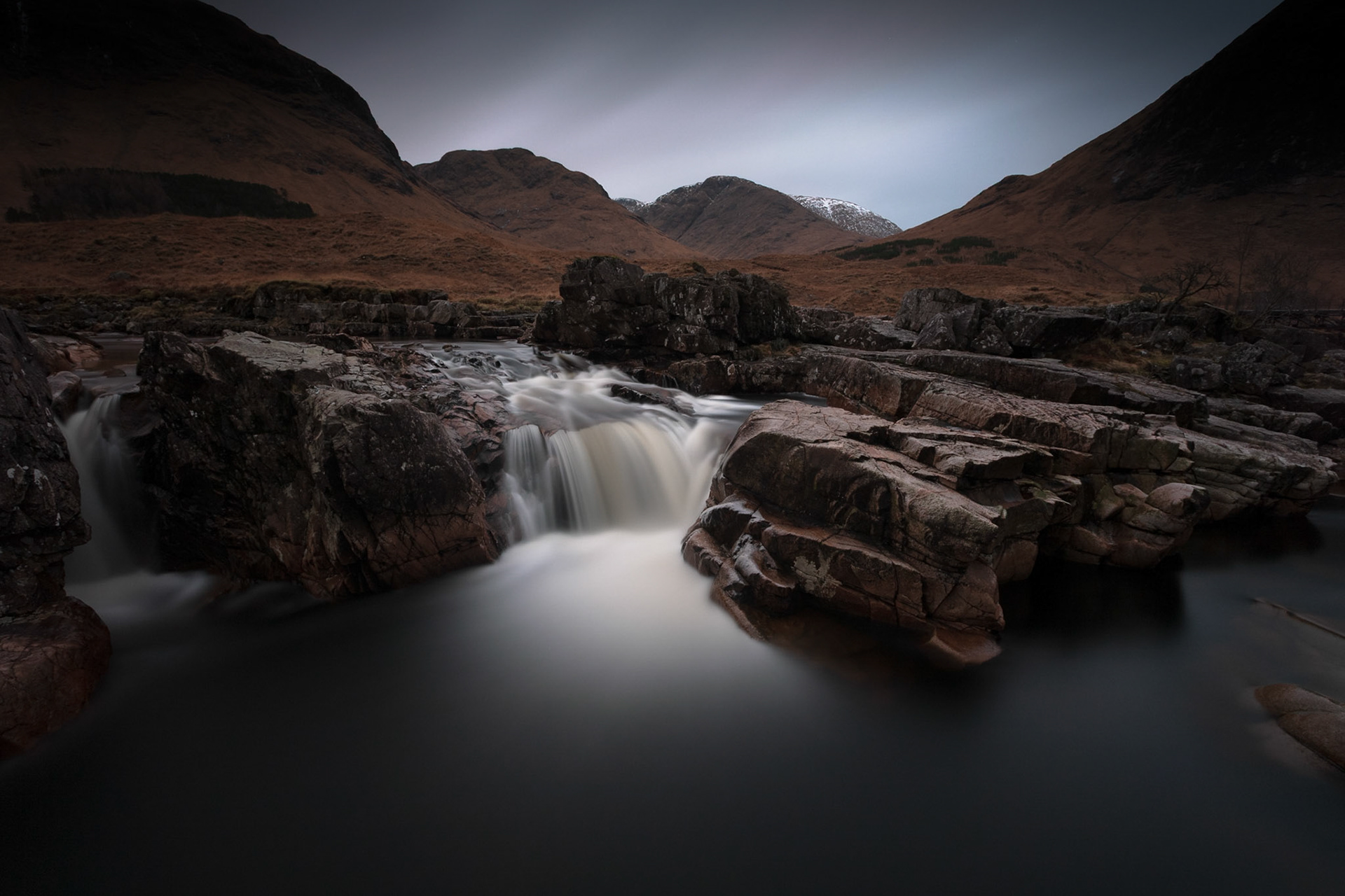 Light fades on a bleak winters day as a dark and peat stained river falls down its solitary, rock strewn glen.